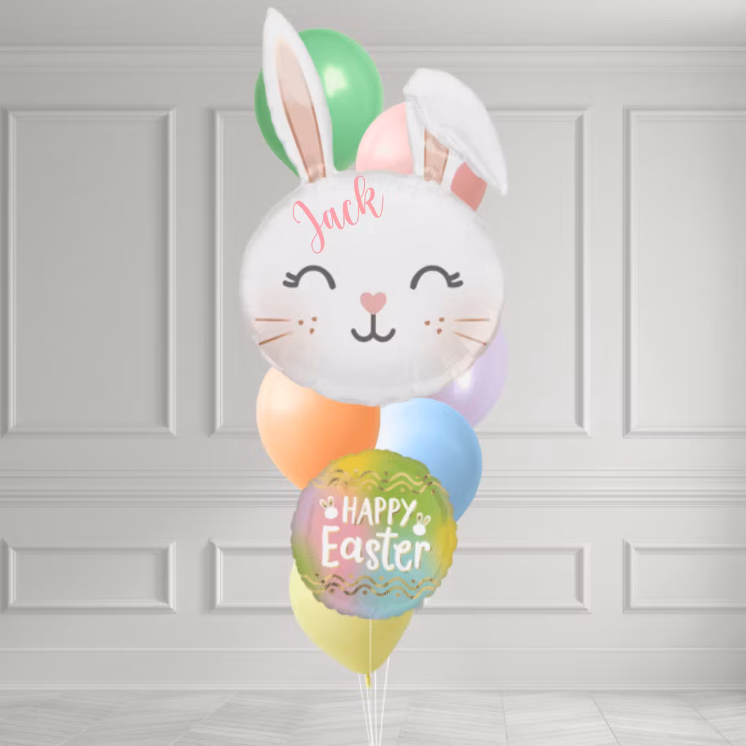 Vad är påsken utan en busig liten kanin? Den här buketten med en glad kaninballong och en "Happy Easter"-folieballong i sällskap av mjuka pastellfärger är perfekt för att sätta guldkant på påskfirandet. Ställ den i köket, vid fikabordet eller i barnrummet för en riktig påskboost.