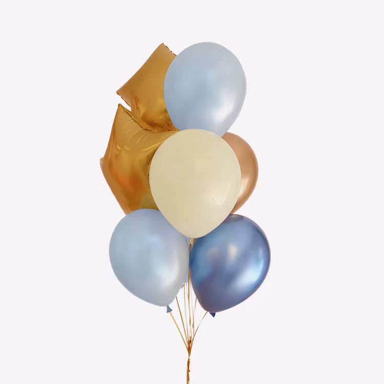 Rising Stars innehåller 2 foliestjärnor i guld, 2 ljusblå latexballonger, 1 chrome blå, 2 elfenbensvit och 1 guld.