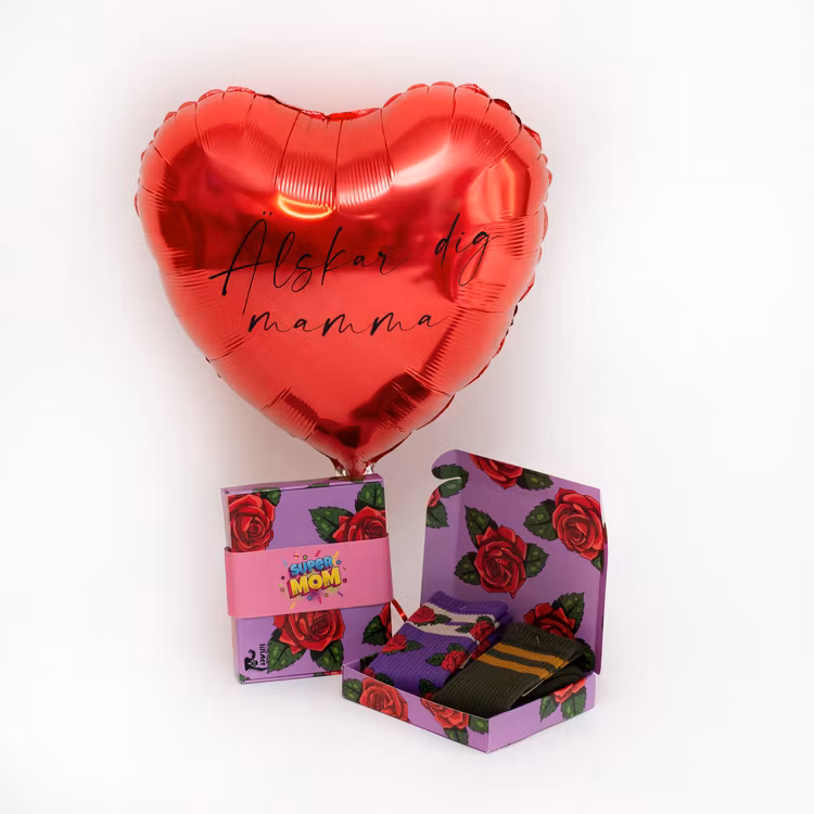 Ett paket innehåller en folieballong i form av ett hjärta med personlig text (max 4 ord) och 2 par strumpor från bästa Lillster som kommer i en cool presentförpackning. Ballongen kommer i en låda 45x45 cm med ditt valda strumppaket till mottagaren. Paketet levereras till mottagarens närmsta DHL ombud där du själv hämtar ut ditt paket. FRAKT ingår. Alla morsdagspaket levereras fredagen 28/5. Glöm inte att ange färg och text på ballongen.