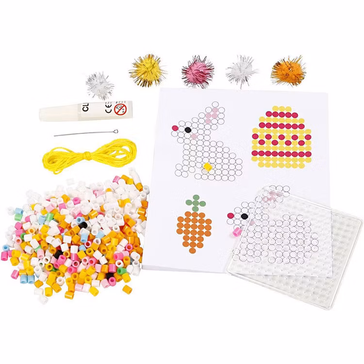 Materialset till påskdekorationer av rörpärlor. Settet innehåller; rörpärlor i 5 olika färger, kvadratisk pärlplatta, glitterpompomer, upphängningssnöre, upphängningsögla och lim.